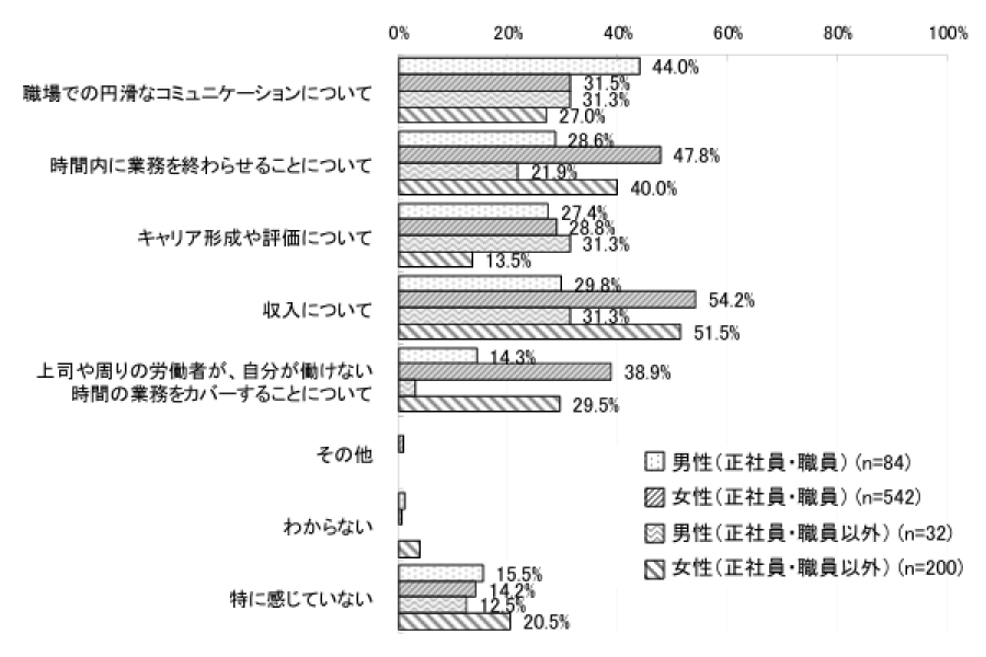 「男性(正社員・職員以外)」では「職場での円滑なコミュニケーションについて」「キャリア形成や評価について」「収入について」が同率で31.3%ともっとも回答割合が高くなっており、「女性(正社員・職員以外)」では「収入について」が 51.5%でもっとも回答割合が高く、次いで「時間内に業務を終わらせることについて」が 40.0%となります。