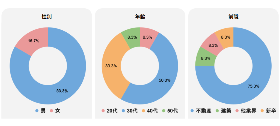 30代のメンバーを中心に、不動産経験者はもちろん、他業界からジョブチェンジをしたスタッフと併せて、幅広い経験と豊富な知識を持ち合わせたプロ集団となっております。